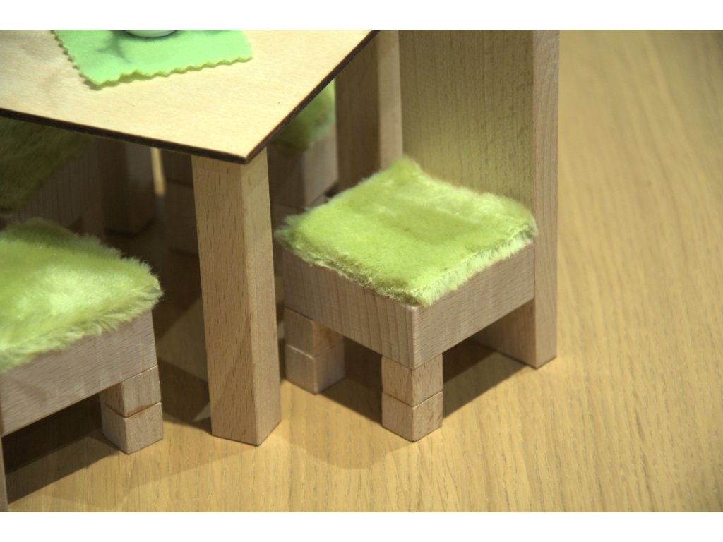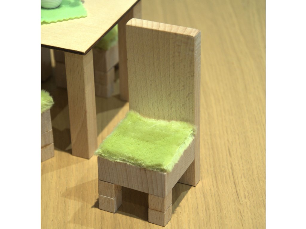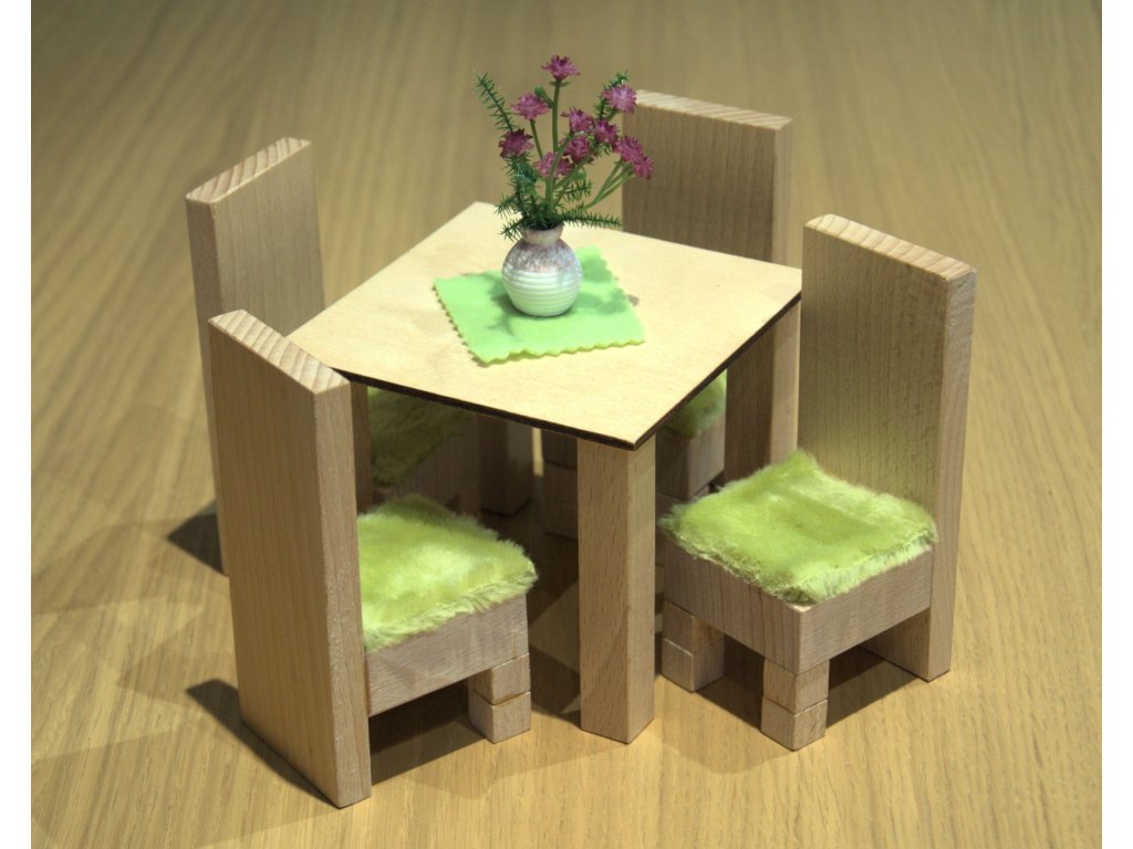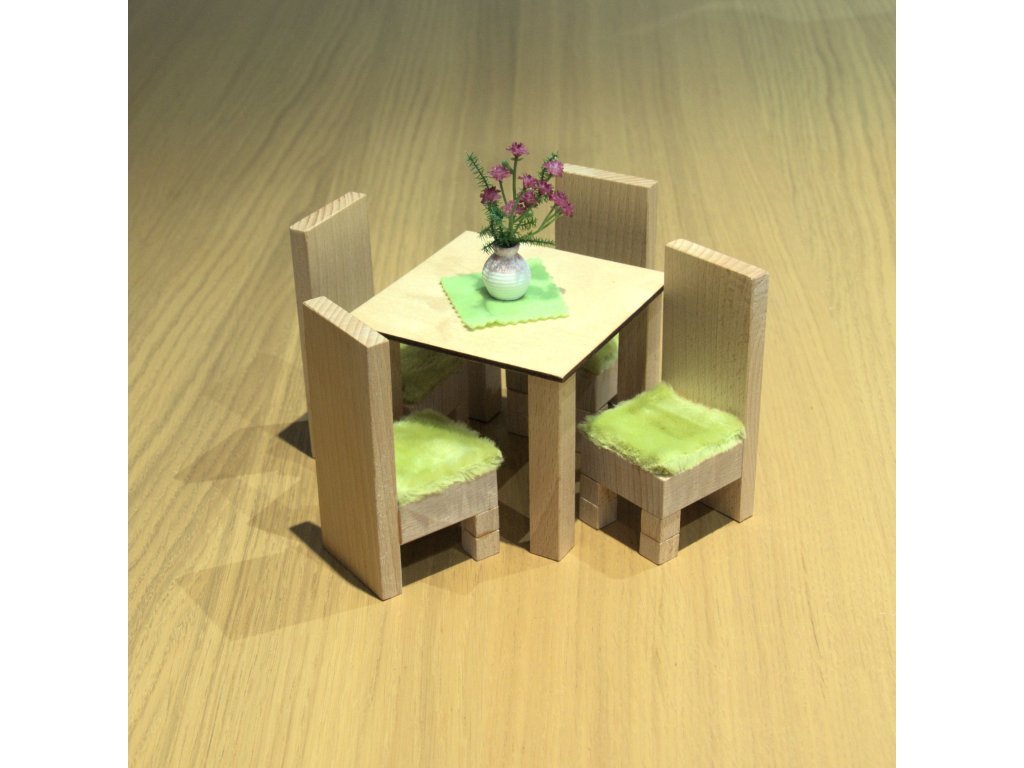 - Rozměry: židle 5 × 5 × 12 cm a stůl 11 x 11 x 9,5 cm