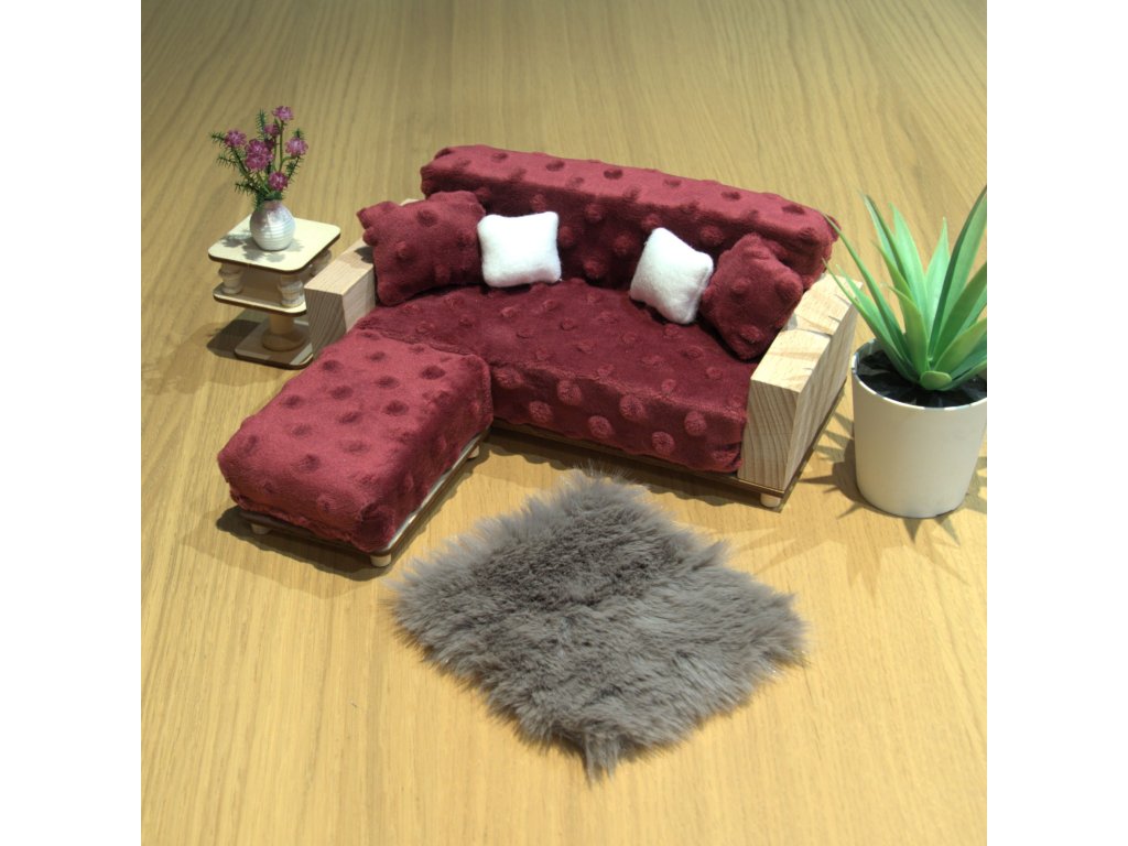 Když se panenky chtějí opravdu rozvalit, rohový gauč je jasná volba! Tento stylový kousek je ručně vyrobený z kvalitního dřeva, doplněný měkkým textilním polstrováním a navržený tak, aby krásně zapadl do rohu domečku. Skvěle ladí s konferenčním stolkem, křesílkem i chlupatým koberečkem – zkrátka obývák snů pro panenky typu Barbie a menší.