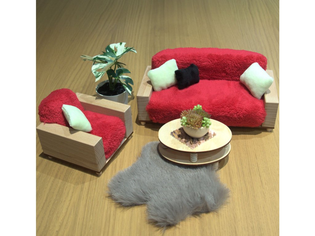 Když se panenky sejdou na čaj o páté, potřebují místo, kde si pohodlně posedí! Tato sedací souprava obsahuje stylový gauč a ladící křesílko – oba kousky jsou ručně vyrobené z kvalitního dřeva a doplněné měkoučkým textilním polstrováním a polštářky. Ideální do obýváčku pro panenky typu Barbie a menší, kde se pohodlí snoubí s hravým designem.